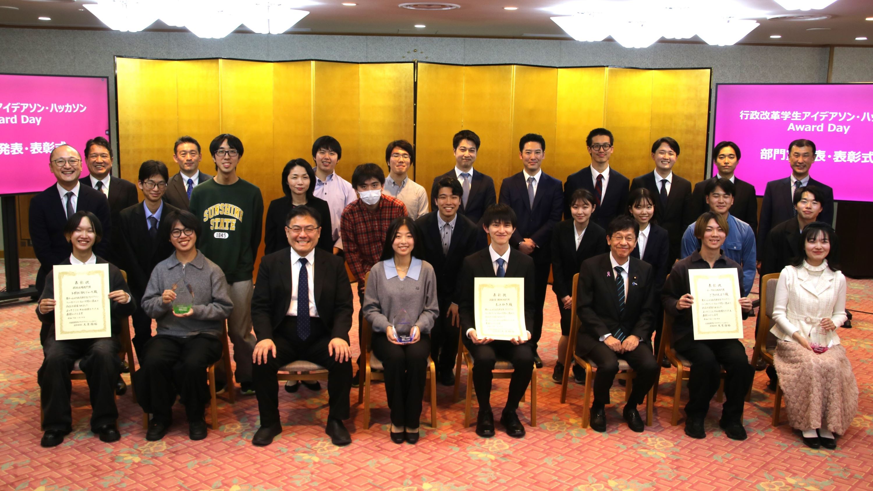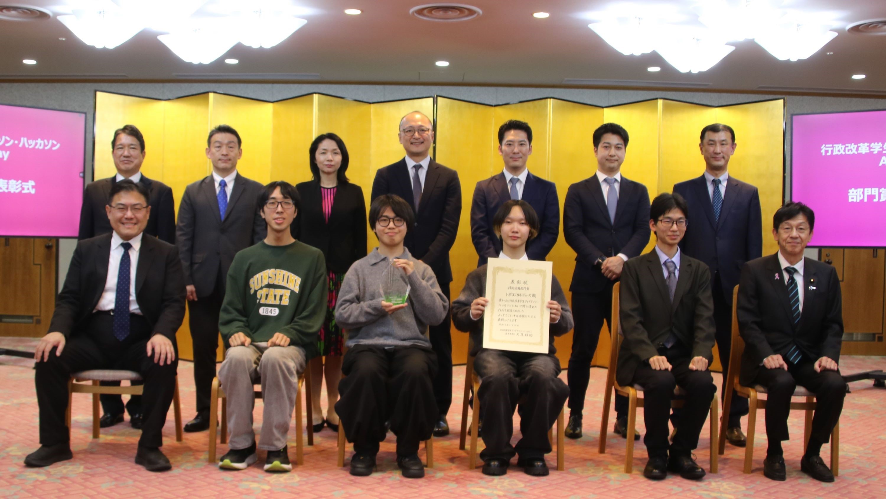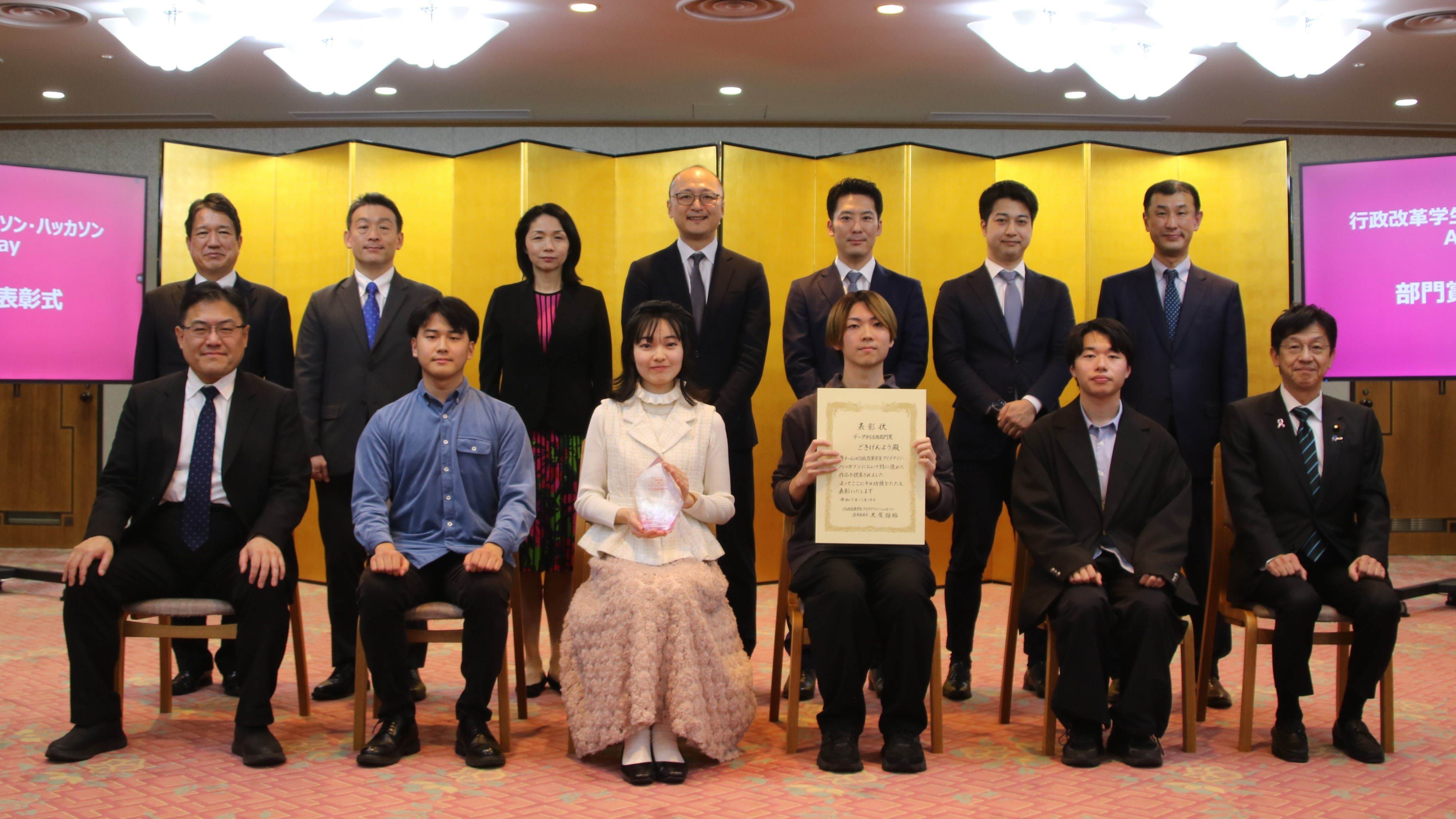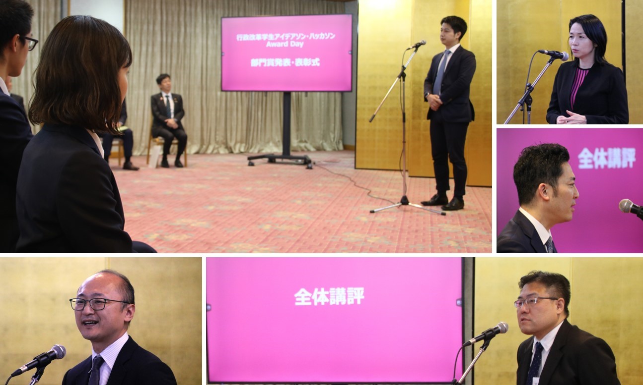 各部門賞の発表です。選考委員より選出のポイントについて紹介したうえで、受賞チームから受賞の感想や今後の抱負が述べられました。また、松本行政改革担当大臣より、各チームに対する労いと将来への期待の言葉が述べられました。集合写真